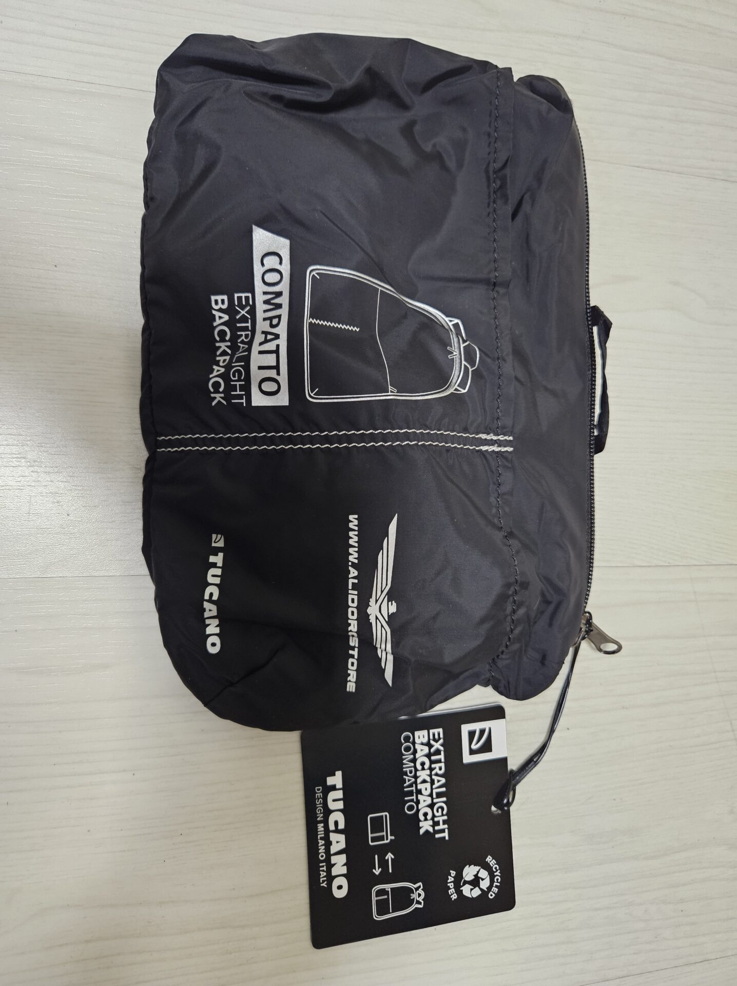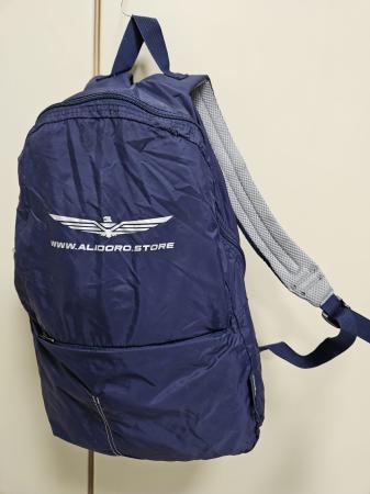 Pratico zainetto griffato (realizzato in collaborazione con la Tucano), colore nero e blu (misura in versione compatta 17cm x 24cm).